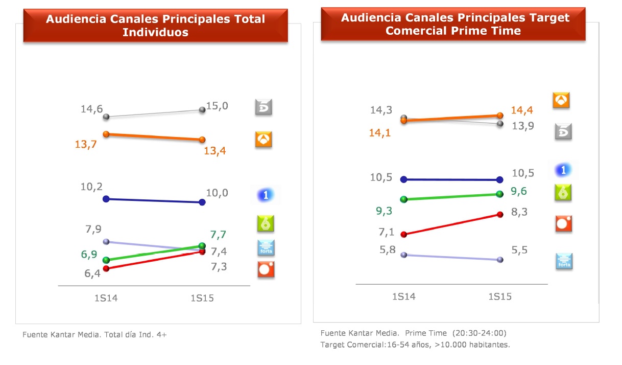 Atresmedia no puede competir con la internacionalización de Mediaset, que explotó con eficacia los derechos del Mundial de fútbol de Brasil. Su batalla está en el «prime time» con algunos programas y escalar en el mercado publicitario.