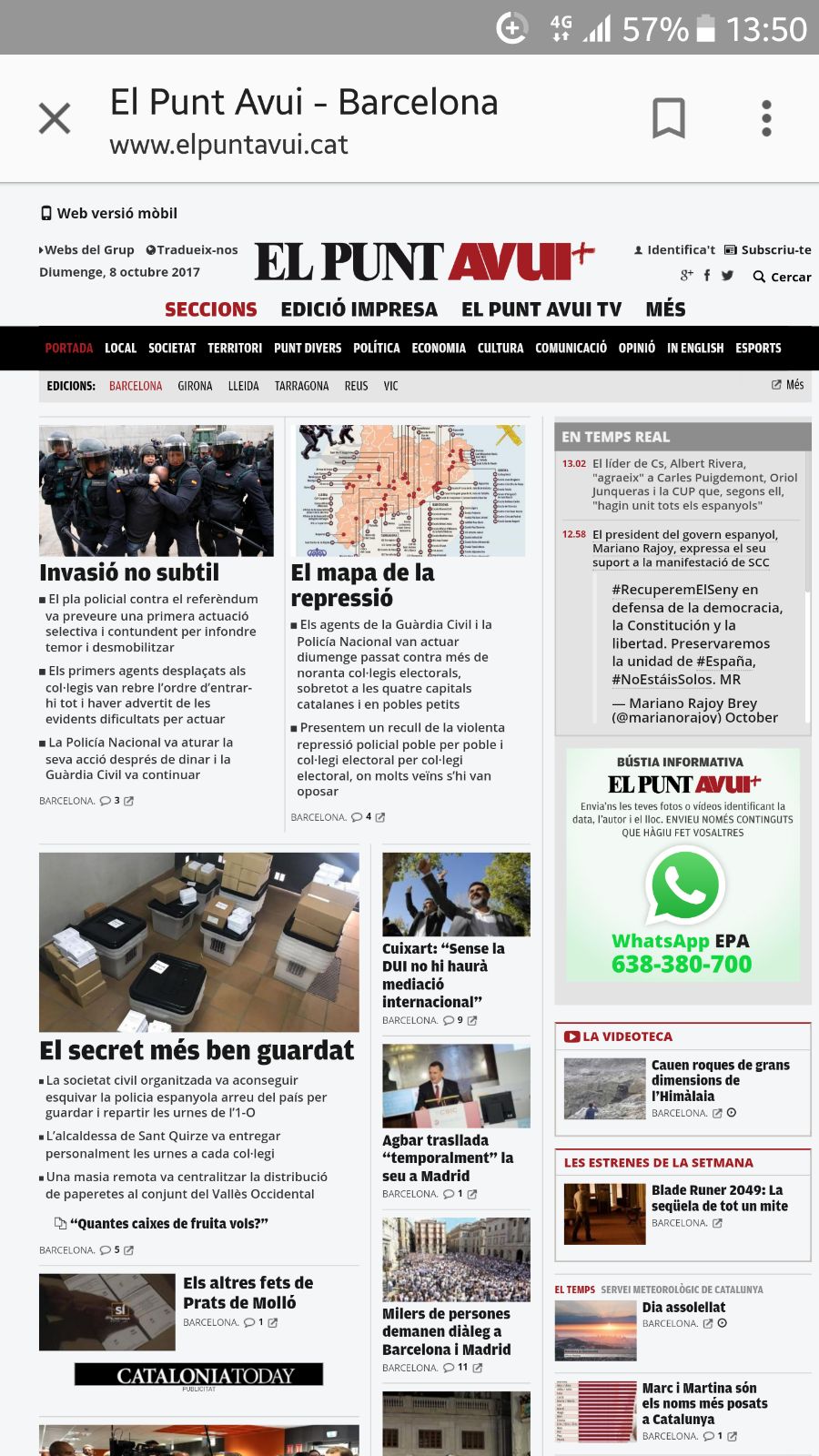 El «avestrucismo» también es clamoroso. El diario Avui, de patrimonio público, silenció la manifestación multitudinaria del día ocho de octubre en Barcelona. La cobertura del evento fue la más extensa realizada por los medios hasta la fecha.